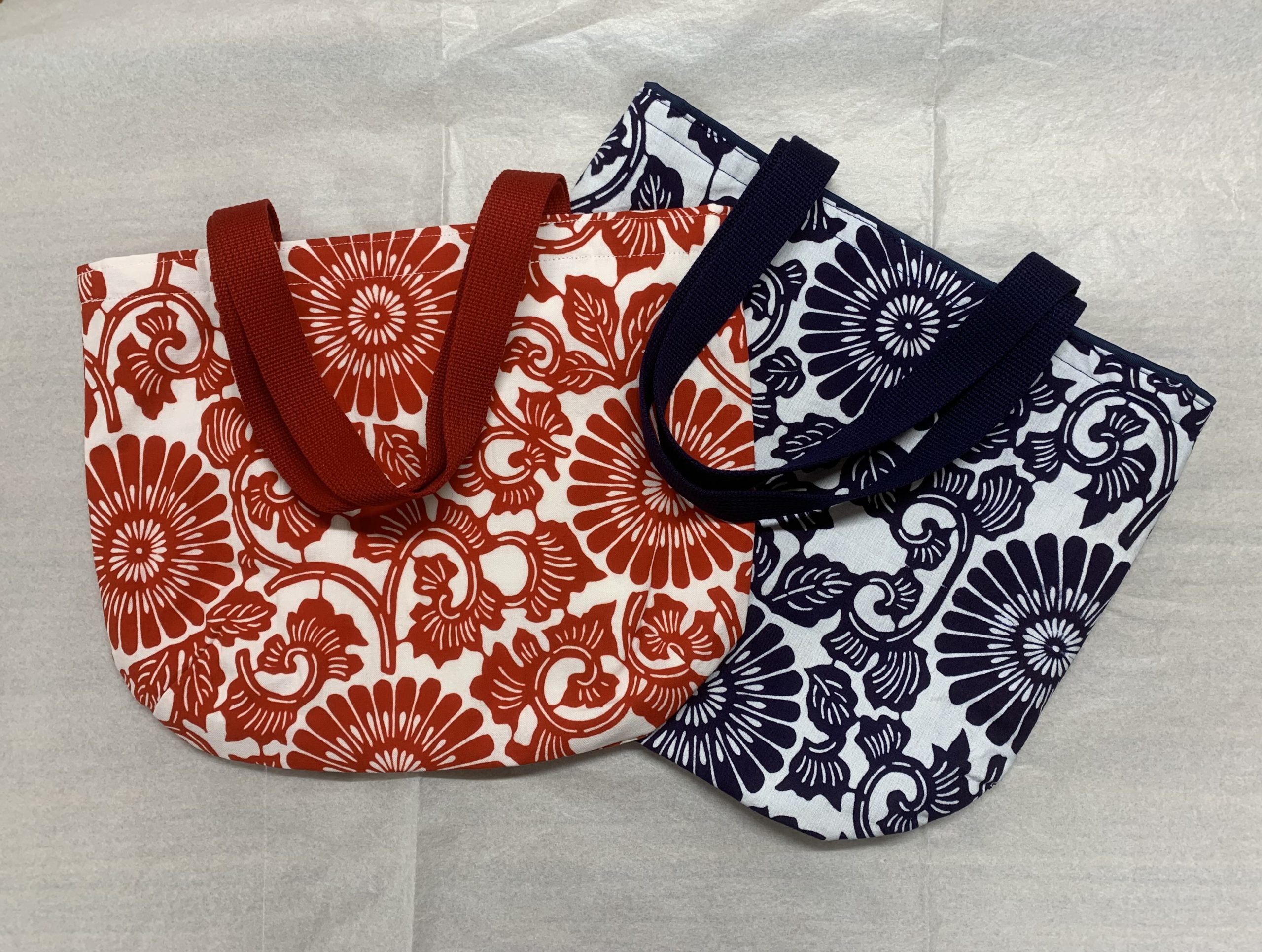 当社オリジナル河内木綿文様柄菊柄で各6色展開。マチ・内ポケット付き。